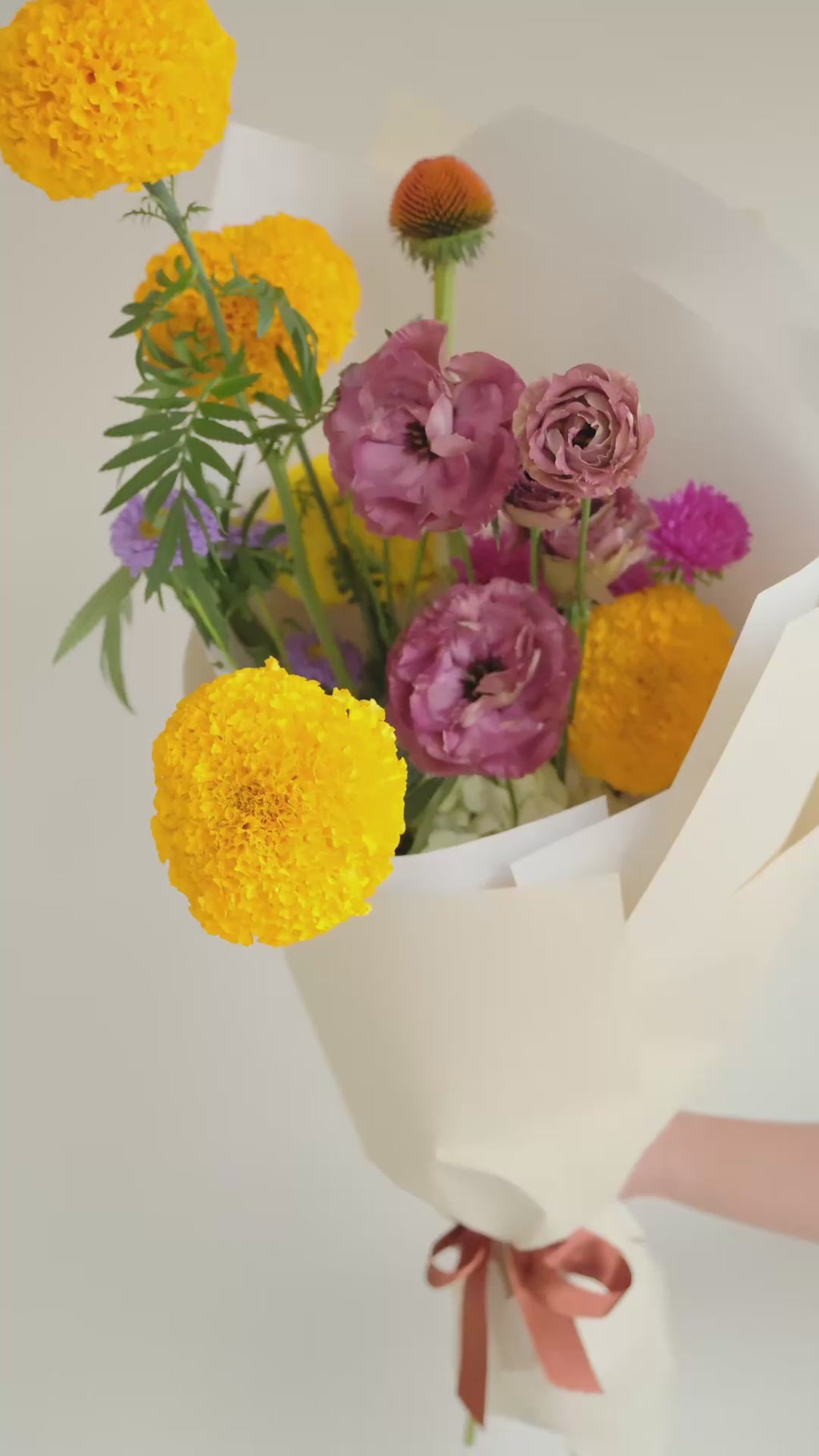 Mix floral en diversas tonalidades, su presentación es en ramo. Con una cosecha floral muy especial de una finca en Sasaima (Cundinamarca), entre Marigold, Matsumoto, Lisianthus, Echinacea, etc.